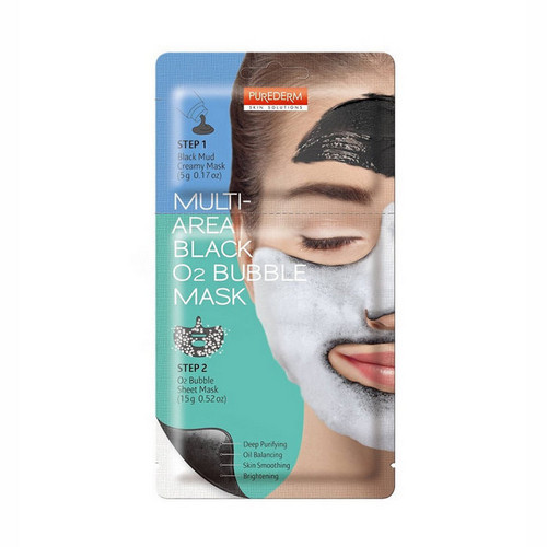 يحتوي PUREDERM Multi Area Black O2 Bubble Mask على قناع كريم مع الطين الأسود (الخطوة 1) وقناع من القماش مع فقاعات الأكسجين (الخطوة 2) ، ويوفر العناية بالبشرة في مناطق مختلفة ، سواء بالنسبة للجبهة أو مناطق أخرى من الوجه.